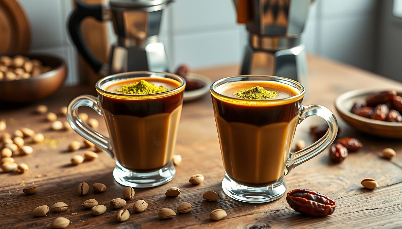 A rich, aromatic moka pot coffee featuring bright Sri Lankan Ceylon beans, topped with a unique Middle Eastern-inspired crema made from sumac, dates, and molasses, finished with fragrant toasted pistachio dust for an exotic yet approachable home brewing experience.