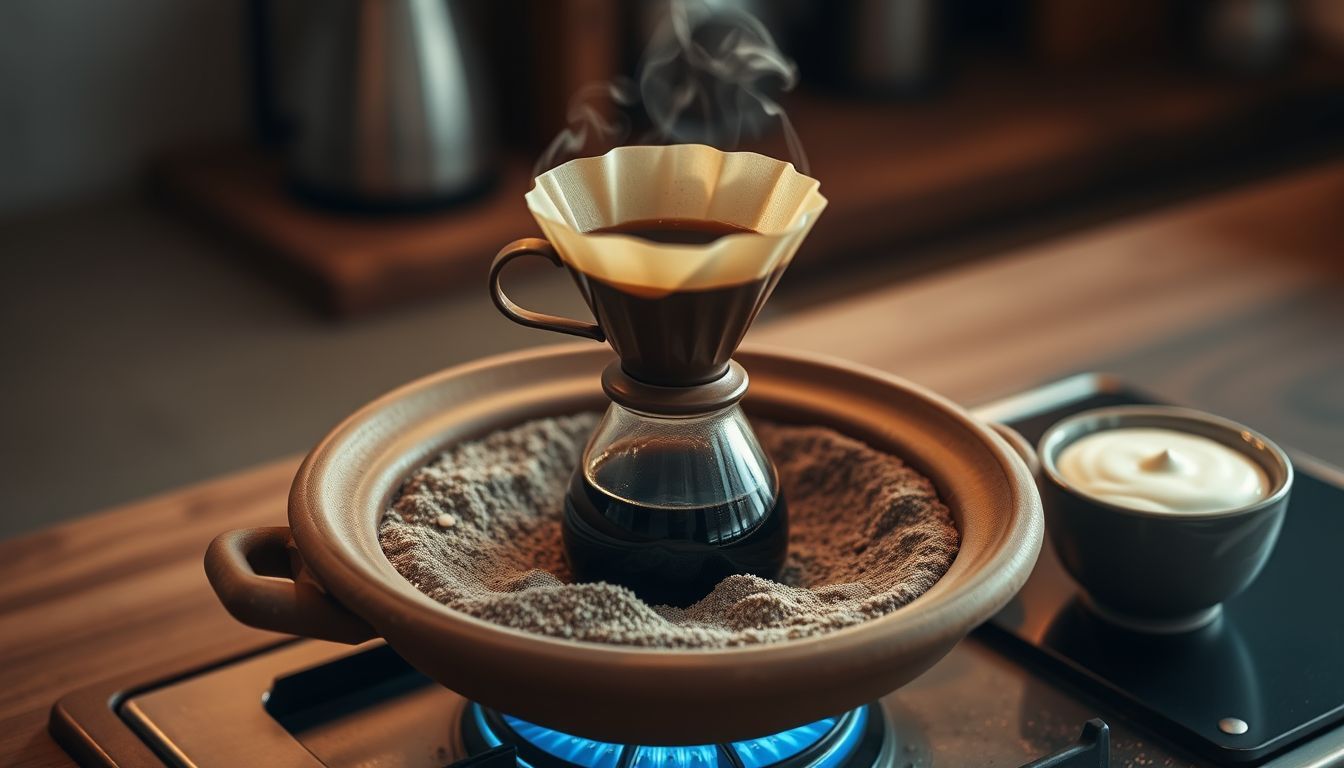 A unique brewing method inspired by traditional sand-bath coffee preparation, using a tagine to create gentle, even heat distribution. The umeboshi brine adds a subtle salted plum complexity that complements the earthy Laotian beans beautifully.